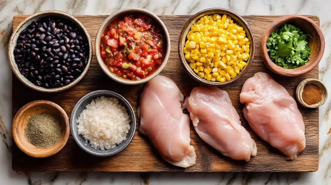 At its core, it’s made with chicken breasts, salsa, black beans, corn, and a few southwest-inspired spices like cumin and chili powder. Some folks add cream cheese for a creamy version or finish it with lime and cilantro.